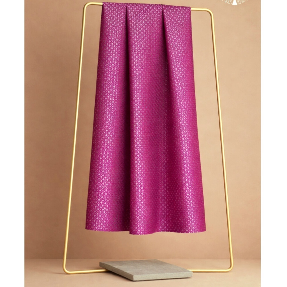 Experience timeless elegance with this luxurious Banarasi fabric crafted in a vibrant bright magenta pink shade 💖. The fabric showcases intricate all-over geometric weaving, beautifully enhanced with subtle silver zari work ✨, giving it a rich shine and premium finish.