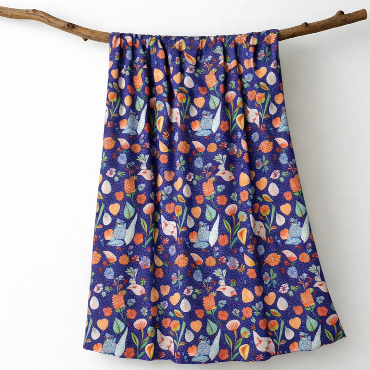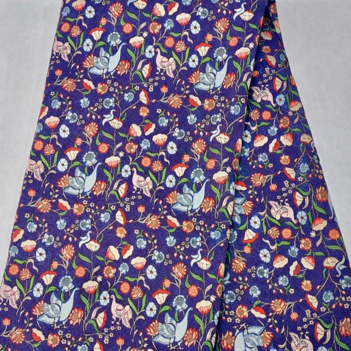 The fabric features a dense, multi-coloured pattern of flowers, leaves, and various birds (including peacocks or similar fowl) on a deep blue background. The motifs often draw inspiration from botanical illustrations and the natural world, rendered with meticulous precision.