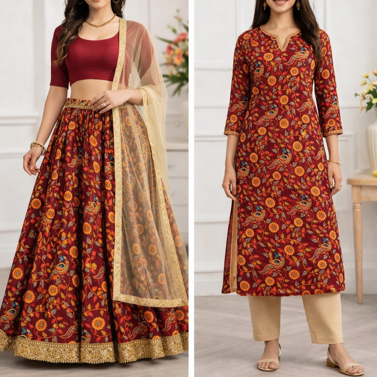 Motifs: The design incorporates stylized birds (peacocks) and floral ‘jaal’ (net) prints.