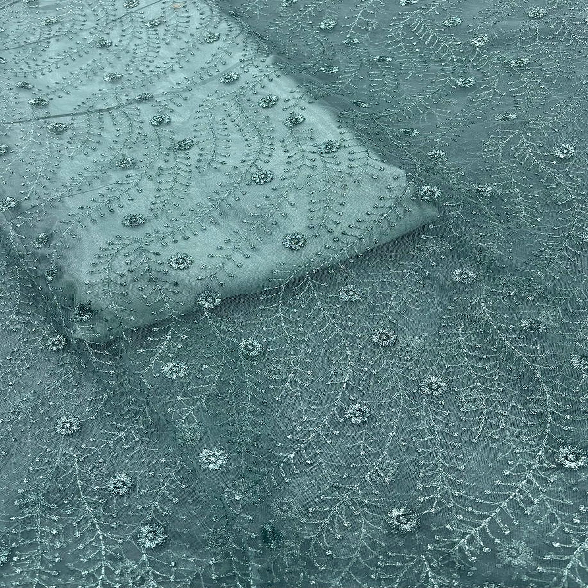 This sage green net fabric features intricate embroidery and beadwork, making it a premium choice for high-end fashion and ceremonial attire.