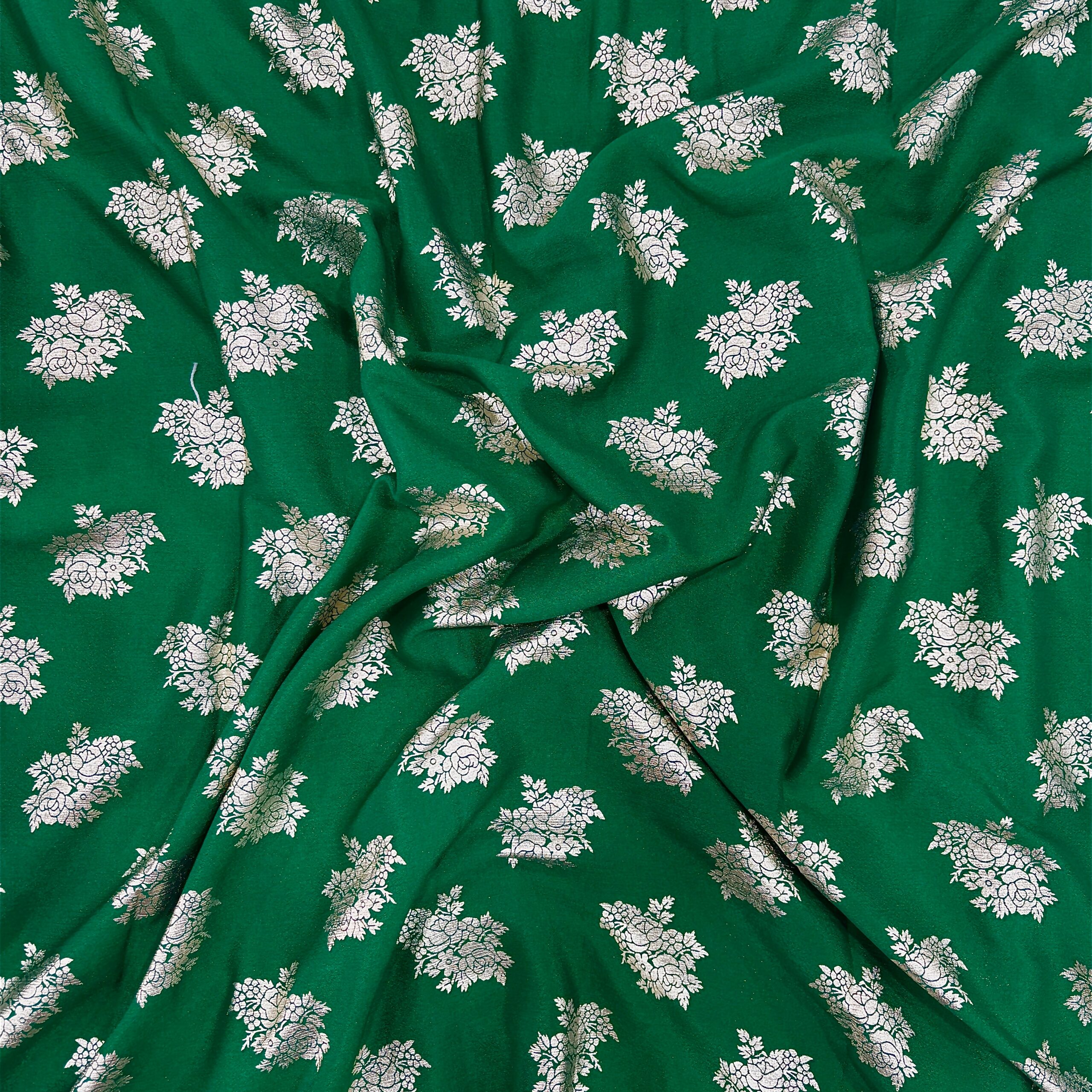 Rich forest green base with elegant silver floral motifs all over, giving a classy and premium look 💚 Perfect for kids frocks, anarkali, gowns & ethnic wear with a soft, flowy, and graceful drape.