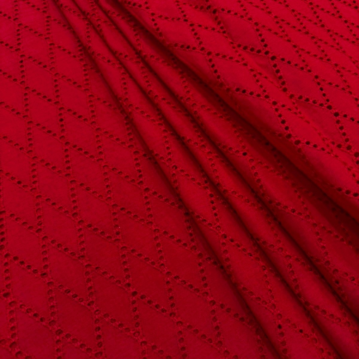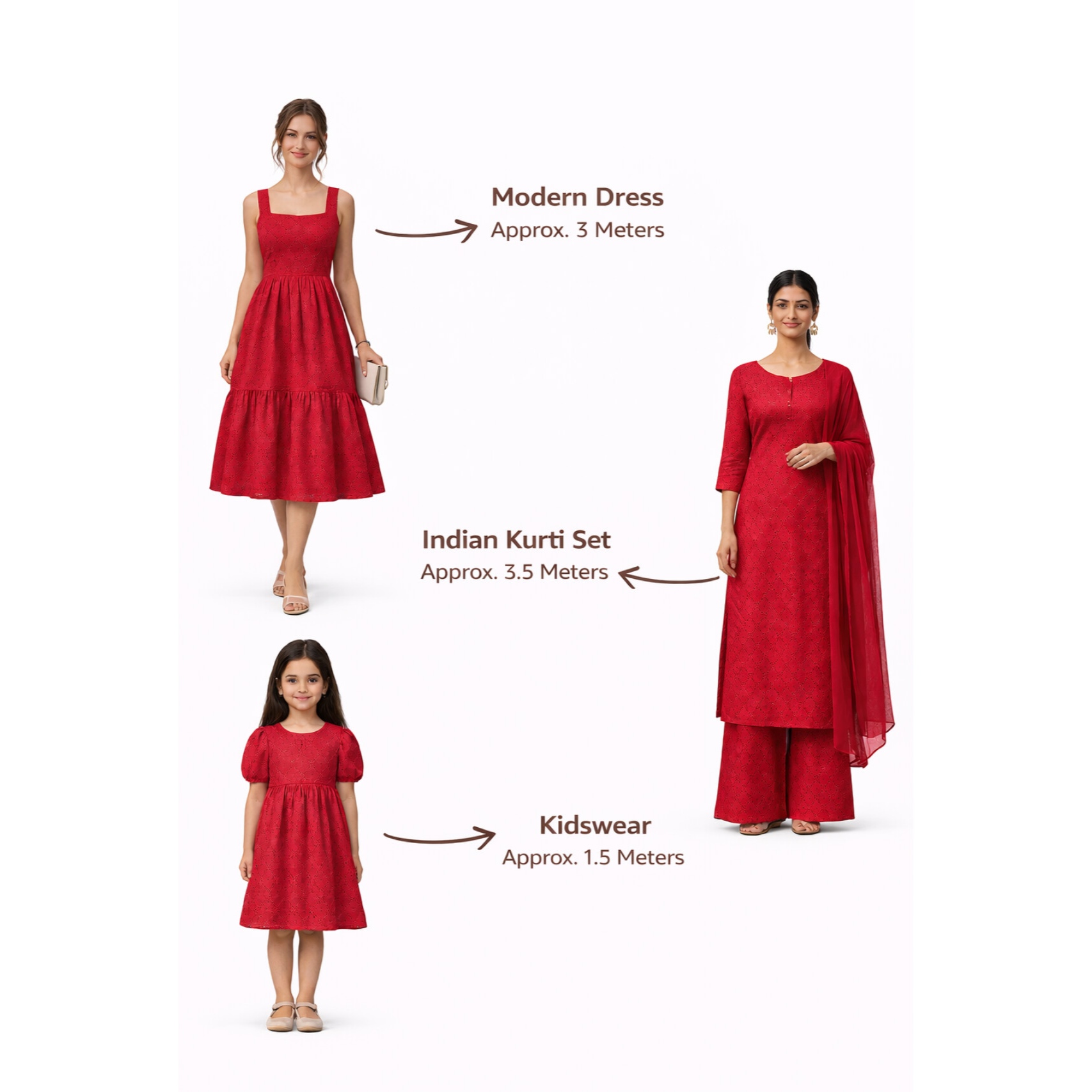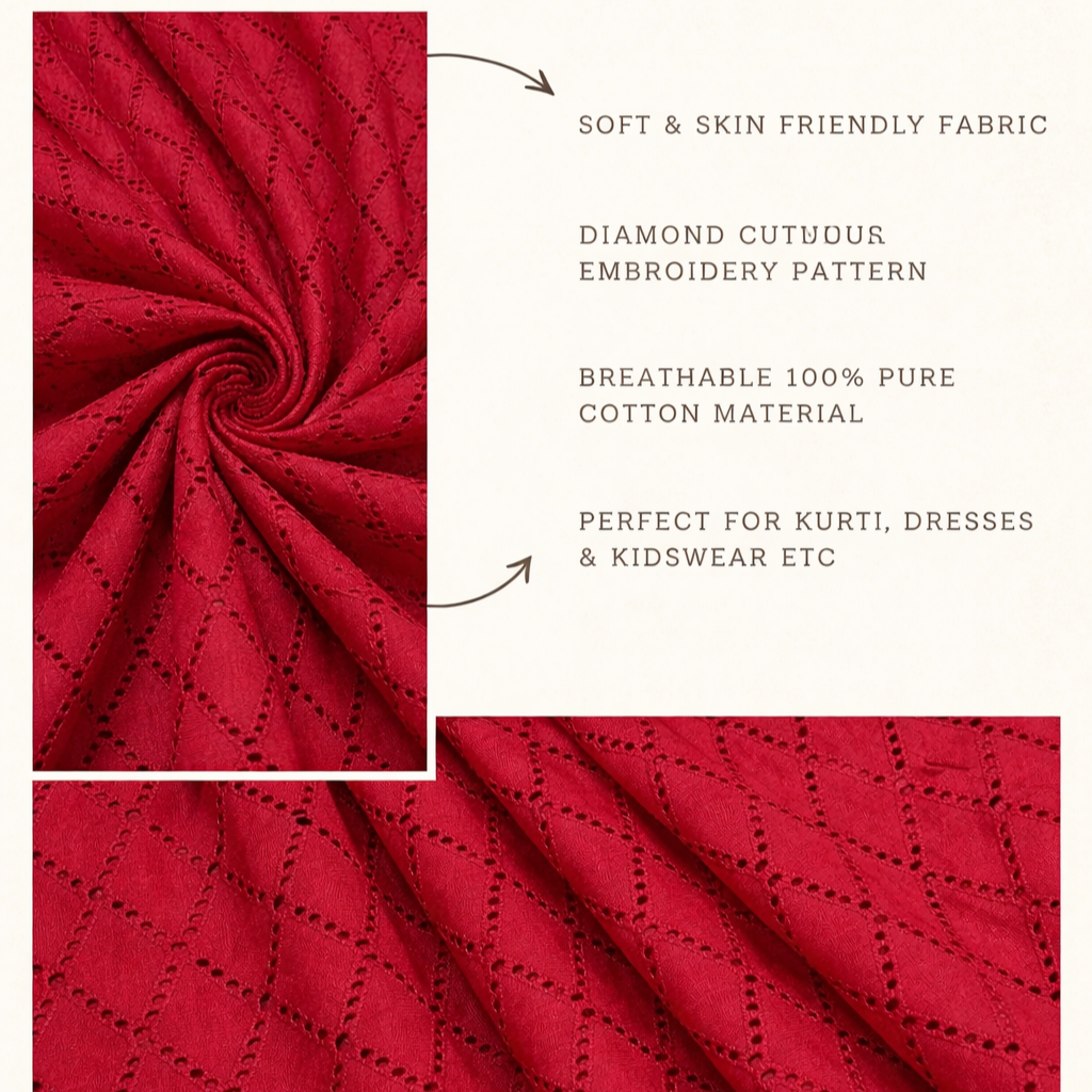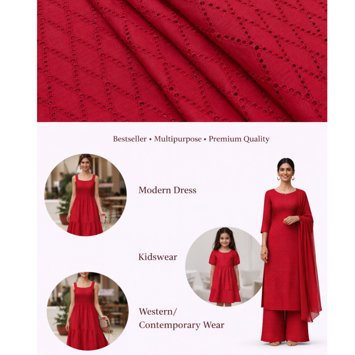 Give your collection a refined and elegant touch with this beautiful rich cherry red Hakoba fabric ❤️. Crafted on a soft cotton base, this fabric stands out with its neatly placed cutwork (eyelet) embroidery, offering a stylish yet subtle appeal.