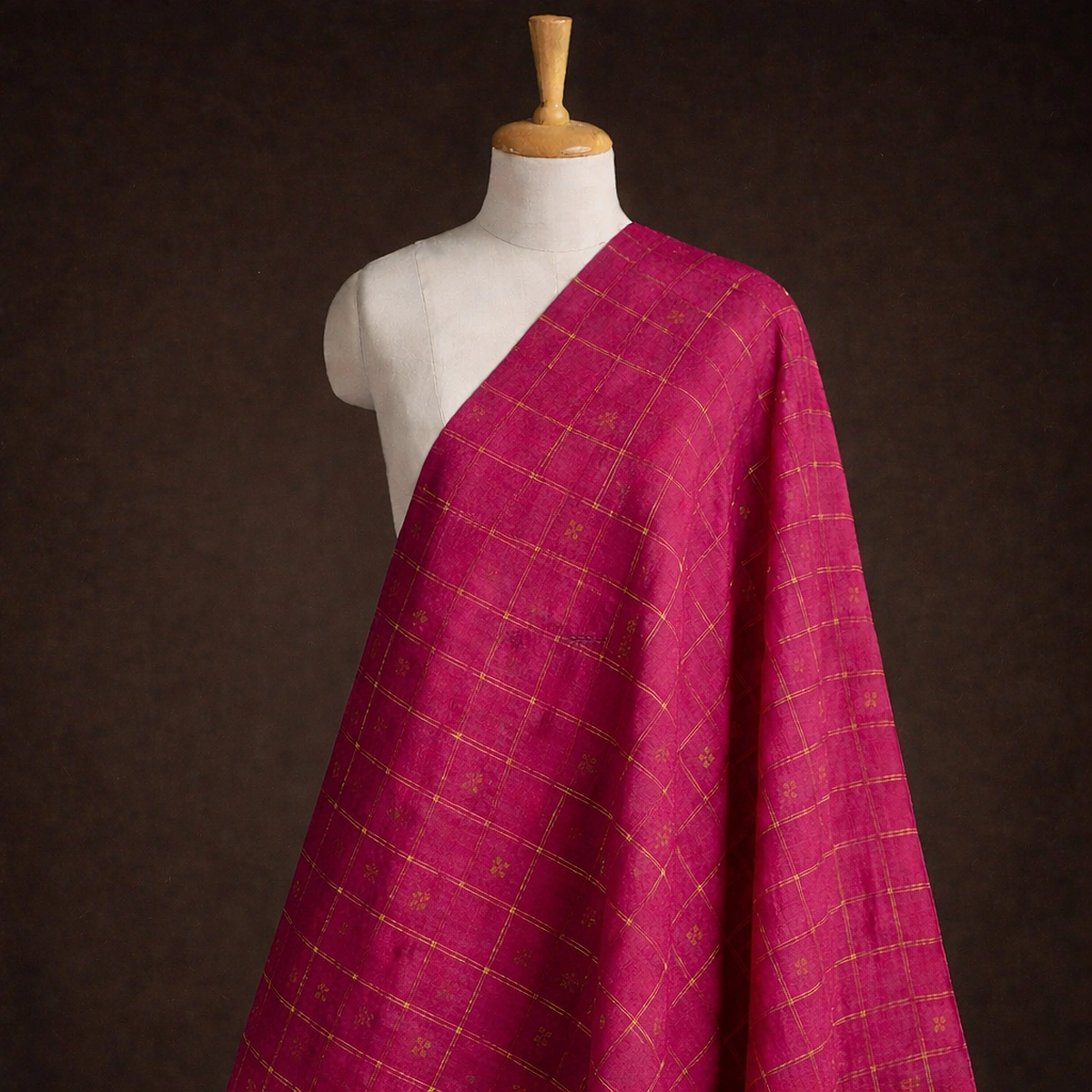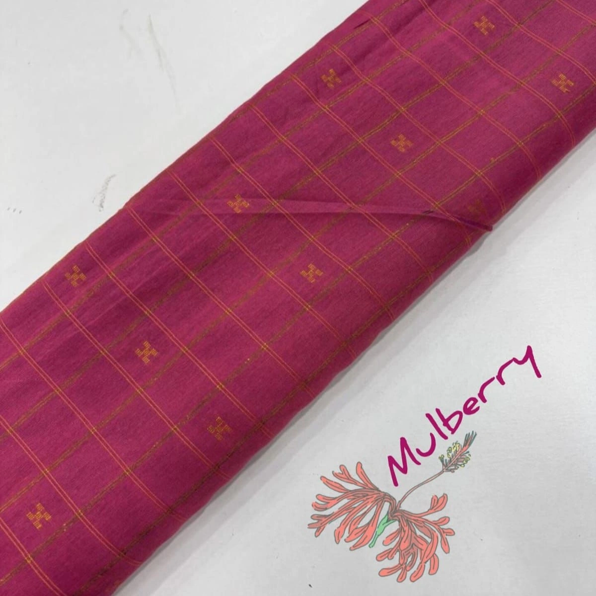 ✨ Mulberry Pink Silk Fabric featuring elegant golden kattam checks and delicate woven butta motifs.