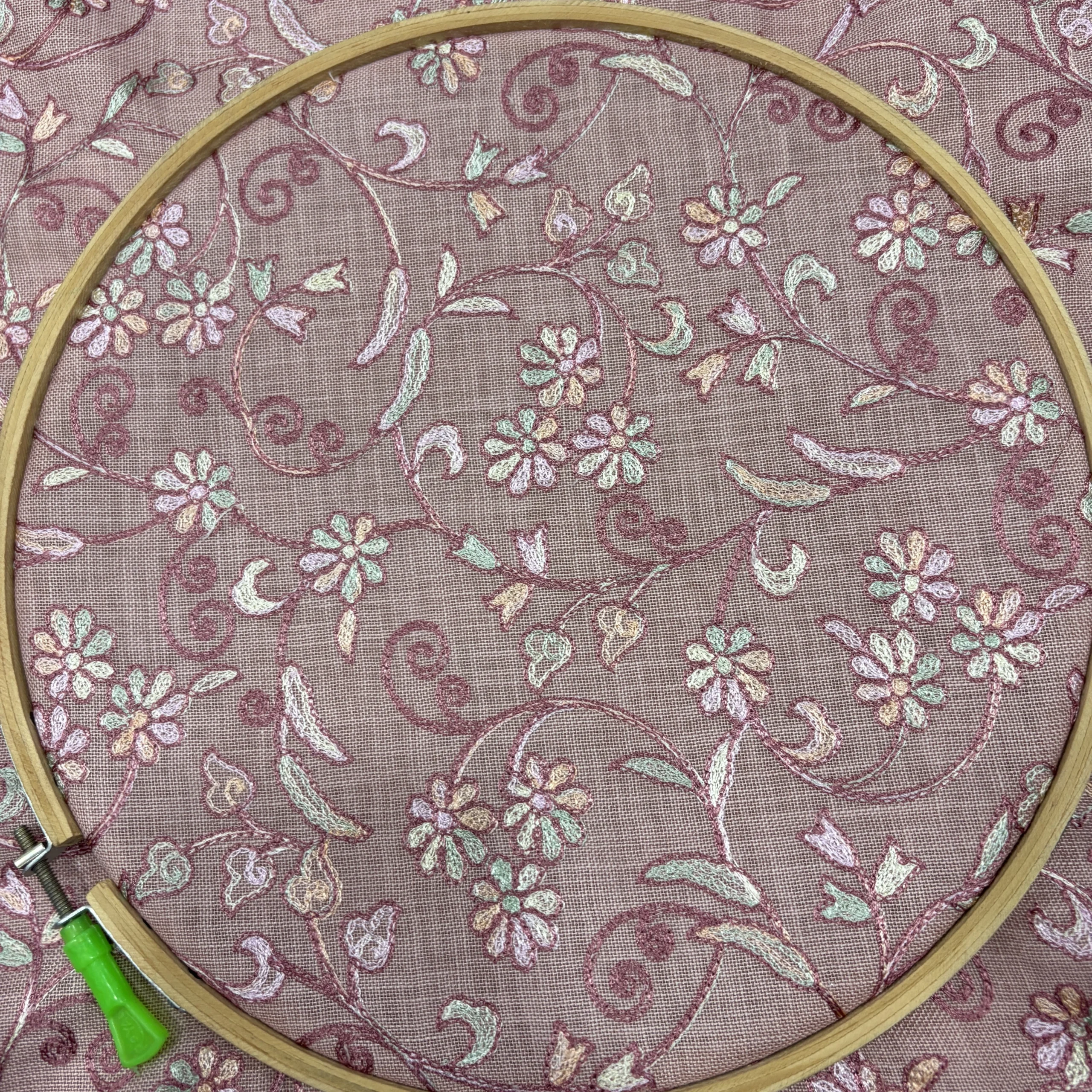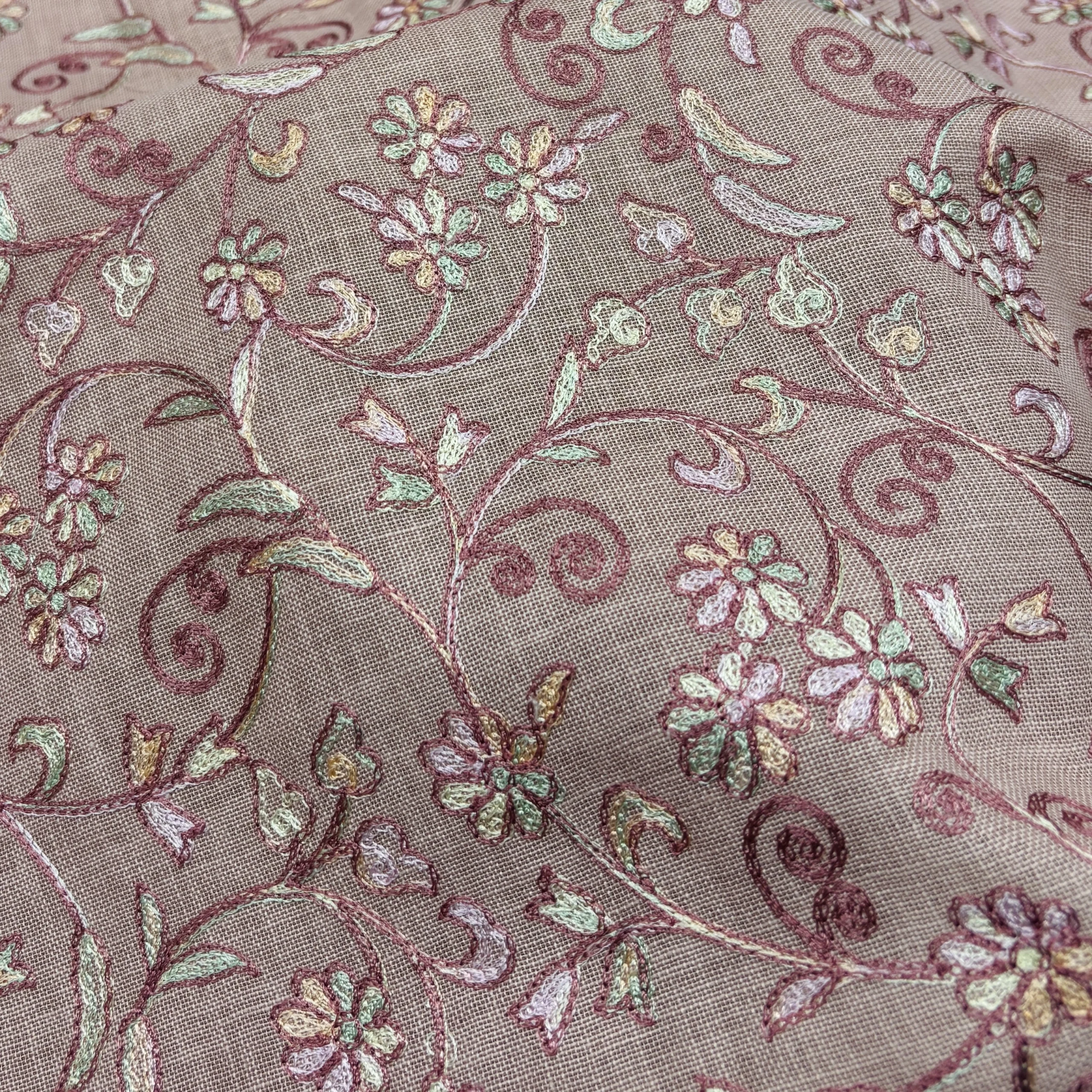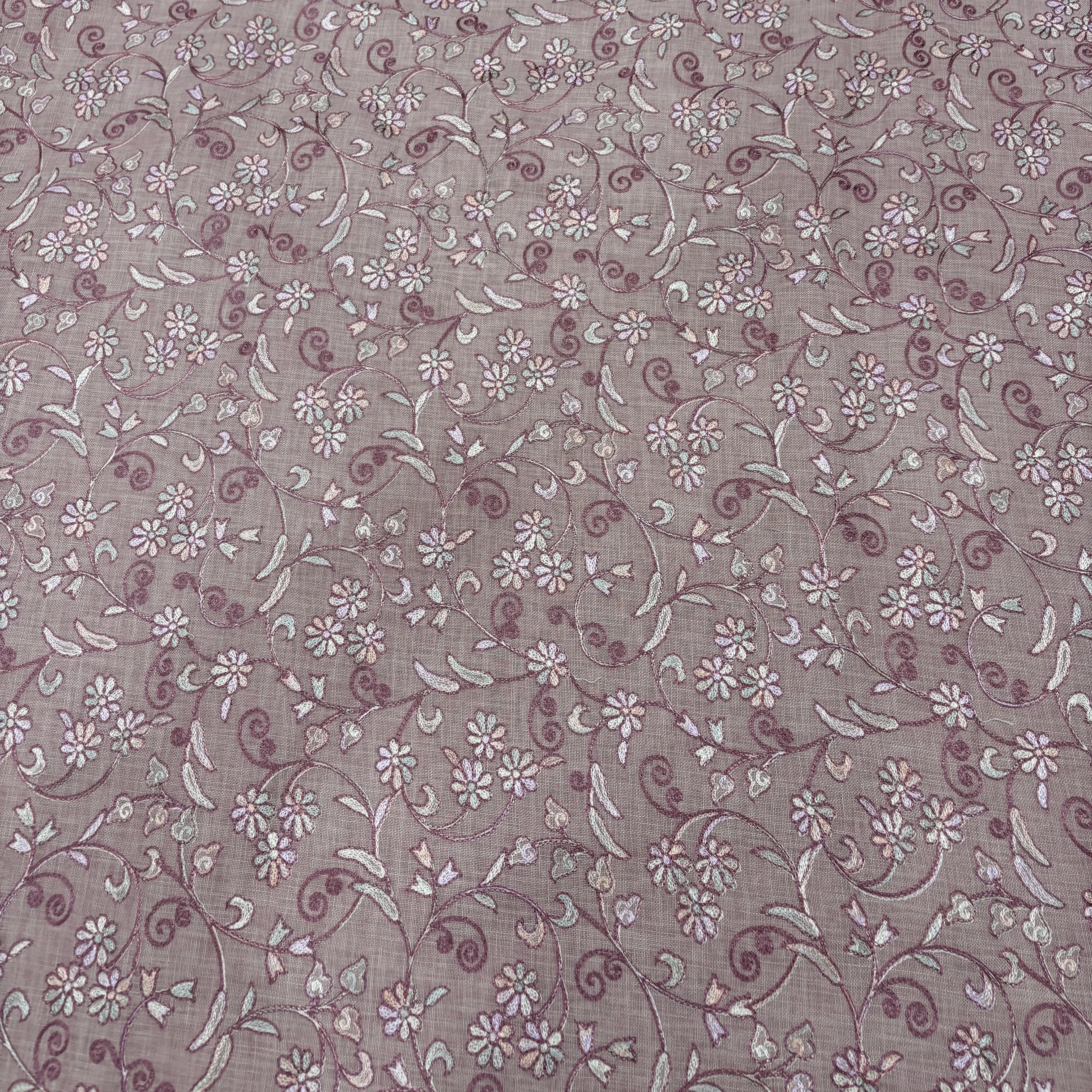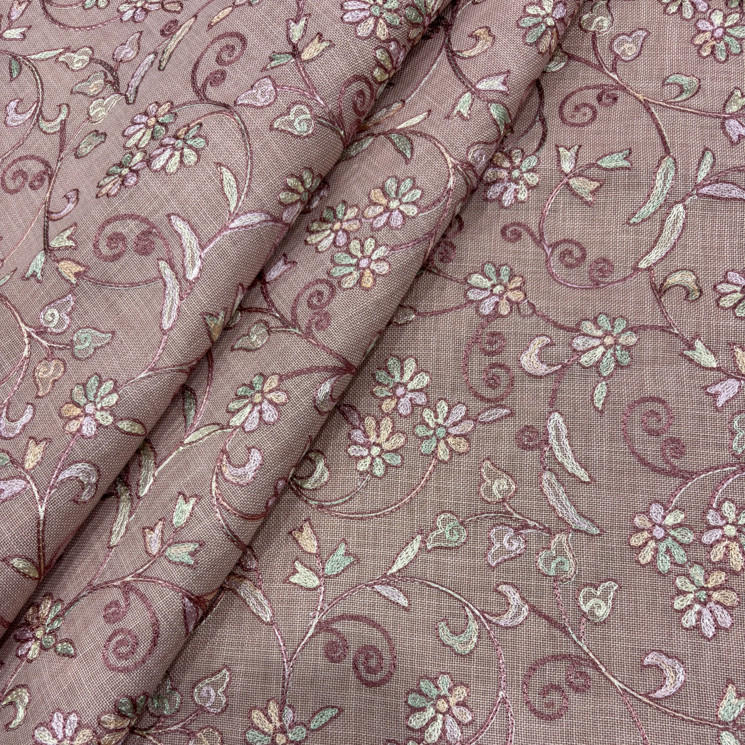 Each element of the design is finely stitched, adding texture and depth without making the fabric feel heavy. The thread work is evenly distributed, ensuring a balanced and premium finish throughout. The combination of dusty pink base and pastel embroidery gives the fabric a soft yet sophisticated visual appeal.