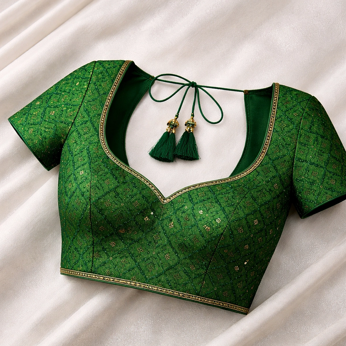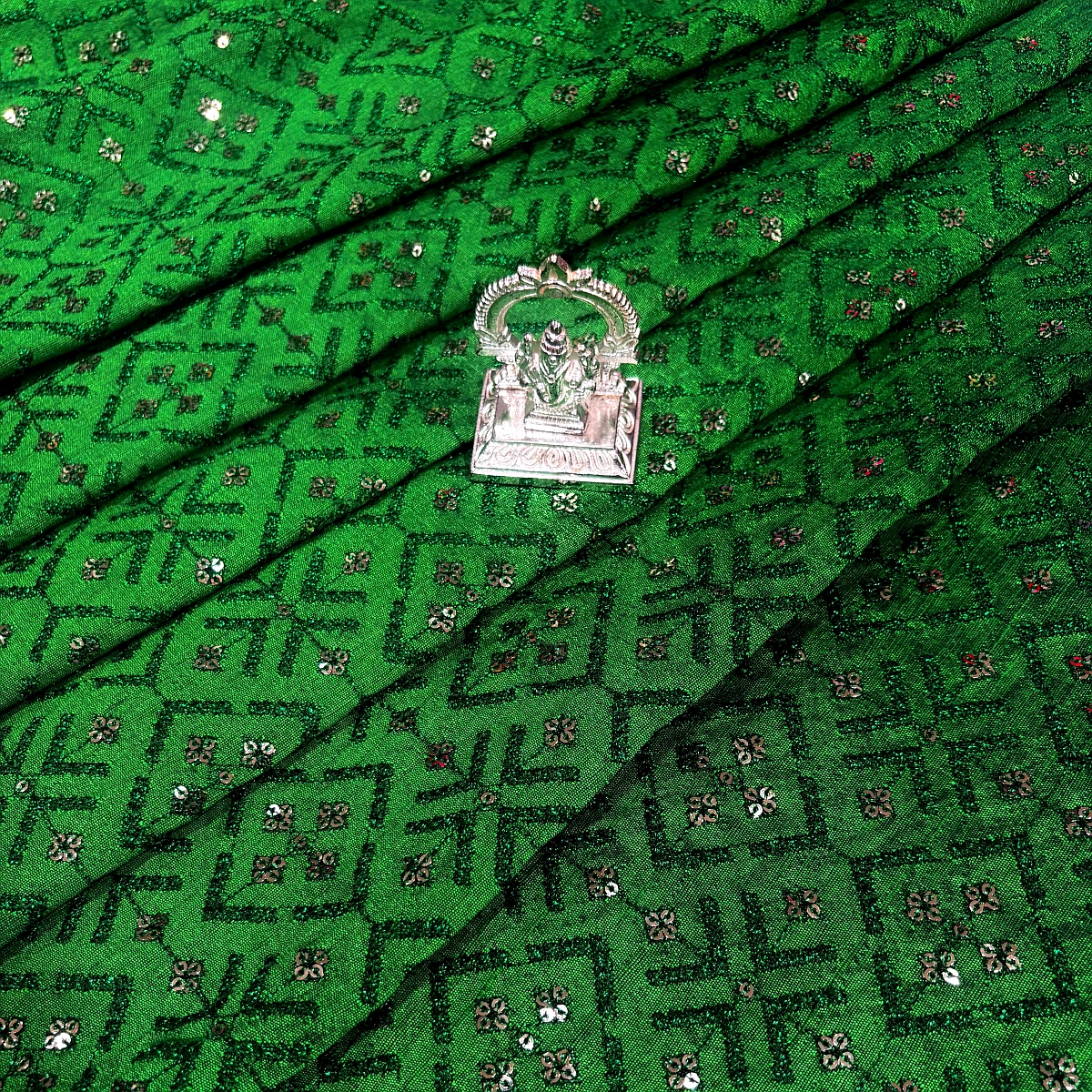 This is a rich green raw silk fabric with a slightly rough and thick texture. It features geometric embroidery with small sequins, giving it a classy and elegant look. The fabric is strong and holds its shape well, making it perfect for blouses and festive wear.